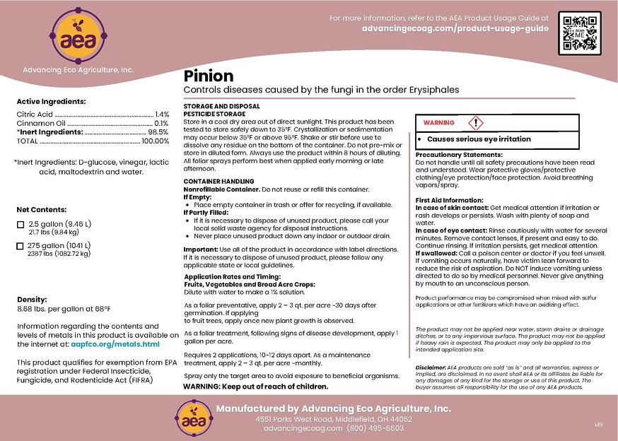 Effective, easy to apply, and safe when used as directed, Pinion for Home and Garden creates an inhospitable environment for disease-causing organisms, helping crops resist new infections and suppressing existing foliar disease pressure, for both fungal and bacterial infections.